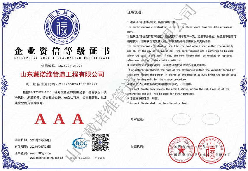 管道非開(kāi)挖修復(fù)工程服務(wù)企業(yè)資質(zhì)證書(shū)